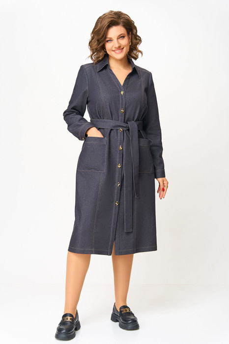 Платье из джинсовой ткани прямого силуэта с центральной застёжкой на петли и джинсовые пуговицы.  Полочки с притачными фигурными планками, с рельефным швом и кокеткой, на уровне бёдер накладной карман с планкой и фирменной нашивкой «Swallow».