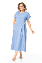 Платье из мягкой шифоновой ткани, на трикотажной подкладке, отрезное по линии талии, шов собран на эластичную тесьму-резинку. Горловина округлой формы, по переду капелька с завязкой. Рукав втачной, короткий.
