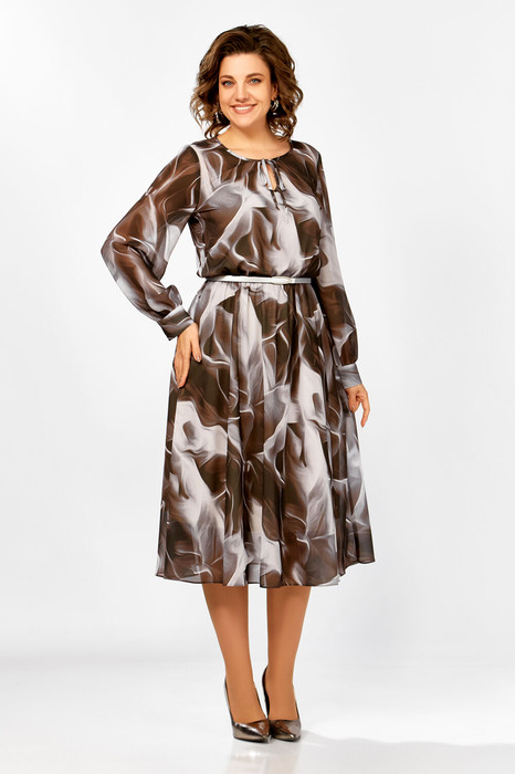 Платье из креп-шифоновой ткани, на трикотажной подкладке, отрезное по линии талии, шов собран на эластичную тесьму-резинку. Горловина округлой формы, по переду капелька с завязкой. Рукав втачной одношовный, внизу со сборкой и манжетой, которая застёгивается на 2 петли и пуговицы.