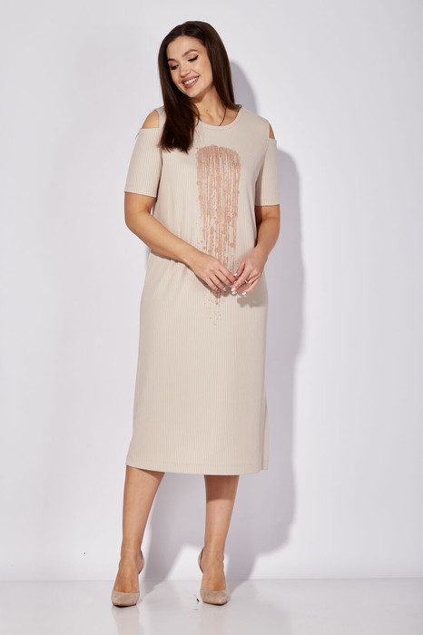 Платье женское, полуприлегающего силуэта, выполнено из трикотажного полотна (типа лапша) Рукав короткий, втачной, с открытым плечом. Вырез горловины круглой формы с подрезной бейкой. Перед задекорирован принтом. По боку, снизу разрез и нашивка. Спинка без особенностей.