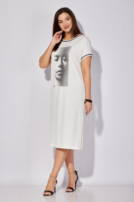 Платье женское, прямого силуэта с коротким, цельнокрайним рукавом. По плечам отрезные кокетки. Вырез горловины круглой формы. Горловина и низ рукавов обработаны подрезными бейками с кантами из отделочной сетки. Перед платья задекорирован современным принтом. По бокам платья разрезы.