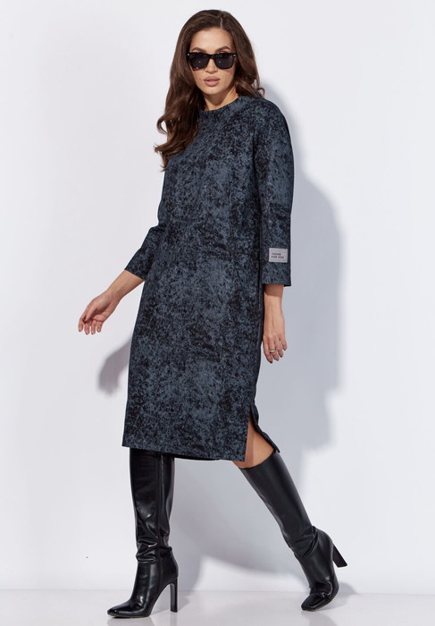 Платье женское, прямого силуэта, с рукавом длинной 7/8. Рукав со спущенной линией плеча. По переду и спинке отрезные кокетки. Спереди рельефные швы от кокетки и функциональные карманы в рельефах. По спинке средний шов от кокетки. Низ платья по спинке удлинен, с разрезами по бокам. Горловина круглой формы, оформлена расширенной стойкой. На рукаве отделочная нашивка.