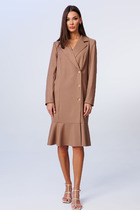 Платье женское, чуть А-силуэта, с втачным рукавом, длинной 7/8. По центру переда объемные, фигурные рельефы. Горловина оформлена небольшой мягкой стойкой. Декором служат съемные цветки-броши. По низу платья отделочная нашивка. Спинка со средним швом. Платье изготовлено из трикотажного полотна "тенсел".