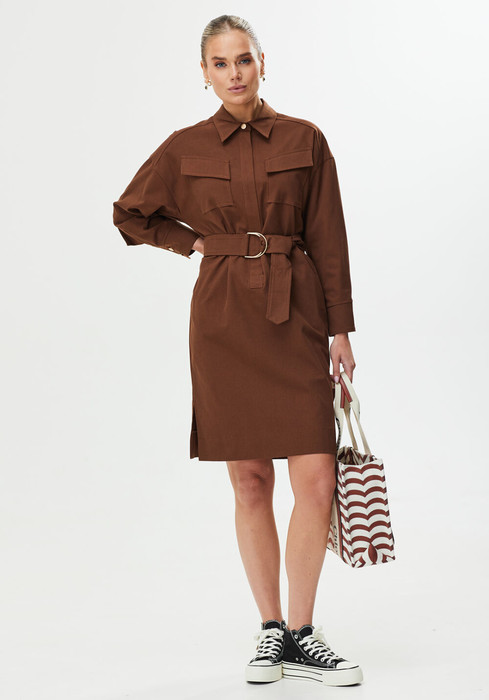 Платье прямого силуэта со спущенной линией плеча.Центральная застежка на тесьму-молнию, которая закрыта декоративной планкой. Рукав длинный с манжетой по низу. По переду платья расположены накладные карманы с клапанами. В боковых швах карманы, по низу платья разрезы. Спинка со средним швом и кокеткой, в которой вставлен волан.