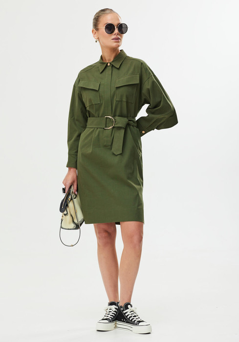 Платье прямого силуэта со спущенной линией плеча. Центральная застежка на тесьму-молнию,которая закрыта декоративной планкой. Рукав длинный с манжетой по низу.По переду платья расположены накладные карманы с клапанами. В боковых швах карманы,по низу платья разрезы. Спинка со средним швом и кокеткой, в которой вставлен волан.