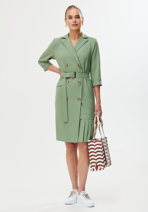 Платье женское полуприлегающего силуэта с двухбортной застёжкой на петли и пуговицы. По переду расположены нагрудные вытачки. На левой части переда - горизонтальный подрез с планкой. Нижняя часть оформлена заутюженными складками, направленными к боковому шву. По правой части переда, в области бедер, расположен горизонтальный прорезной карман с листочкой и клапаном. Спинка цельная с вертикальными талиевыми вытачками. Рукав двухшовный, длиной 3/4, с манжетой по низу рукава. Горловина платья оформлена воротником жакетного типа. В комплект к платью идёт пояс из основной ткани с декоративной пряжкой.