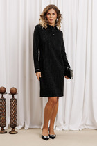 Платье женское полуприлегающего силуэта, выполненное из поливискозы плательной группы. Платье с двухбортной застежкой на петли-пуговицы. Горловина оформлена воротником пиджачного типа. Рукава двушовные, длиной 3/4, по низу обработаны притачной манжетой. По спинке - средний шов и талиевые выточки. По переду расположены нагрудные выточки. В левой боковой части переда вставлена отделочная деталь со складками, направленными к центру, над которой горизонтально расположена пата. В комплект к платью входит пояс из основной ткани с декоративной пряжкой, в цвет фурнитуры.