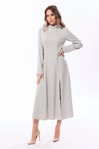 Платье-рубашка полуприлегающего силуэта, длиной миди, выполненое из поливискозы. Перед с нагрудными вытачками и центральной застёжкой на петли и пуговицы на притачной планке. В области груди расположена декоративная нашивка. Горловина обработана воротником рубашечного типа. Спинка цельнокроеная с талиевыми вытачками. Рукав втачной, длиной 3/4, с притачной манжетой, застегивающейся на петлю и пуговицу. В нижней части боковых швов обработаны шлицы, которые застегиваются на петли и пуговицы. В боковых швах в области бедер обработаны карманы. В комплекте ремень.