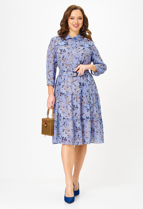 Платье полуприлегающего силуэта, от линии бедер расширенное к низу, выполненное из шифона, на подкладке. В верхней части переда платья - нагрудные выточки, по центру - планка до линии талии, которая застёгивается на петли и пуговицы. В области груди расположены настрочные клапаны. Горловина платья обработана воротником со стойкой рубашечного типа. Нижняя часть платья состоит из воланов. В области талии - шлевки с декоративной тесьмой из основной ткани, спускающейся до середины юбки платья. Рукава короткие с манжетой, застегивающейся на пуговицу. В комплект входит пояс из основной ткани.