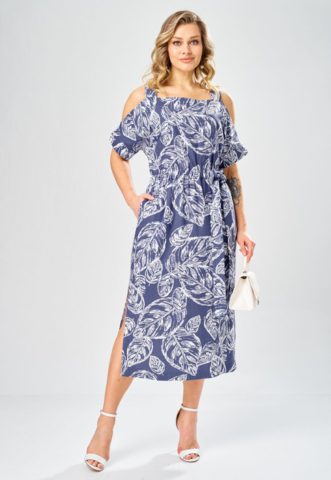 Сарафан женский прямого силуэта на широких бретелях. Выполнен из хлопчатобумажной плательной ткани с растительным принтом. Сарафан с открытой линией плеч и цельнокроенным рукавом до линии локтя. Низ рукава обработан притачной манжетой. Перед сарафана с нагрудными вытачками. Спинка цельнокроенная. По линии талии обработана планка с эластичной резинкой. На планке расположен декоративный пояс, завязывающийся на бант. В области бедер в боковых швах обработаны карманы. В нижней части  боковых швов сарафана обработаны разрезы.