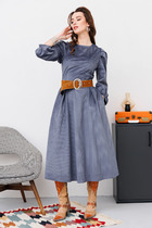 Сарафан полуприлегающий, расширенный к низу. По переду в рельефных подрезах карманы. Вырез горловины ассиметричный. С левой стороны бретель завязывающаяся на бант. Спинка со средним швом (без молнии). Длина изделия 105 см.