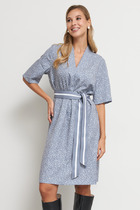 Платье из плательной штапельной ткани с набивным рисунком, свободного покроя, отрезное по линии талии, с короткими втачными рукавами и горловиной овальной формы, обработанной обтачкой. Полочка – с вытачками в области груди. Юбка – из двух ярусов, каждый из которых присборен по шву соединения с верхней деталью.