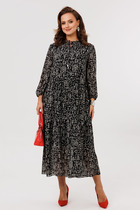 Платье женское полуприлегающего силуэта, отрезное по линии талии с притачным поясом, выполнено из костюмно-плательной ткани "лащенка". Перед и спинка на трикотажной, отлетной по низу, подкладке. Горловина, низа рукавов декорированы отделочной тесьмой, что придает платью нарядный вид.