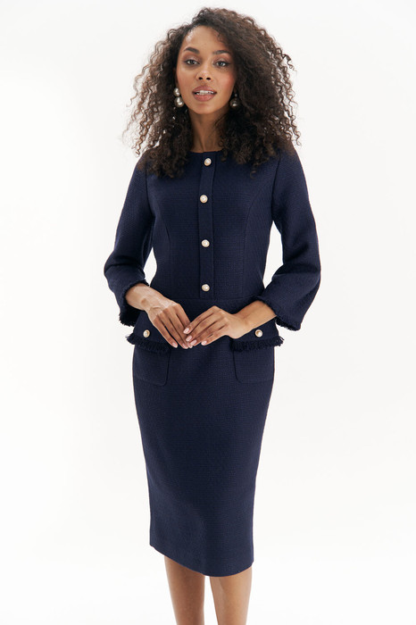 Элегантность в каждой детали – это приталенное твидовое платье. Лаконичный крой подчеркивает фигуру, создавая утонченный силуэт, а жемчужные пуговицы добавляют образу нотку аристократичности. Стильные накладные карманы с бахромой придают модели легкий акцент шика, сохраняя при этом классическую сдержанность. Укороченные рукава подчеркивают запястья, создавая возможность дополнить образ изящными аксессуарами. Идеальное решение для деловых встреч, светских мероприятий или утонченного повседневного стиля.