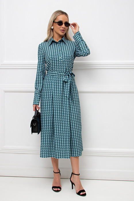 Женственное платье приталенного силуэта. Горловина оформлена отложным воротником на стойке. По переду втачная планка с застежкой на петли и пуговицы. Длинный втачной рукав оканчивается притачной манжетой. Модель отрезная по линии талии, с боку застежка на потайную молнию. Юбка дополнена встречными складками. Пояс из основной ткани в комплекте.