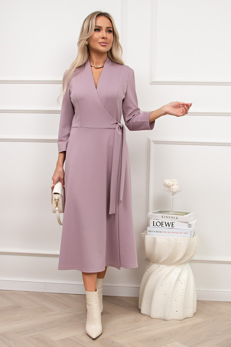 Женственное платье приталенного силуэта изготовлено из трикотажного полотна.V-образная горловина с цельнокроеной стойкой. Втачной рукав длиной 7/8. Модель отрезная по линии талии на запахе, сбоку пояс-завязка. Низ ровный, без разрезов.