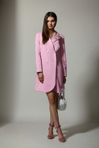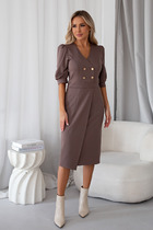 Женственное платье полуприлегающего силуэта изготовлено из трикотажного полотна.V-образная горловина. По переду имитация двубортной застежки. Втачной рукав фонарик оканчивается притачной манжетой. Модель отрезная по линии талии. В боковом шве застежка на потайную молнию. Двойной перед имитирует юбку с запахом. Низ ровный, сзади разрез.