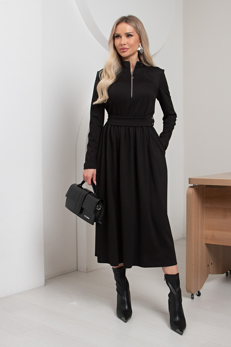 Элегантное платье приталенного силуэта из трикотажного полотна. Горловина оформлена воротником- стойкой с застежкой на молнию. Длинный втачной рукав. Модель отрезная по линии талии, присборена на эластичную резинку. В боковых швах функциональные карманы. Пояс с застежкой на петли и пуговицы. Низ ровный, без разрезов.