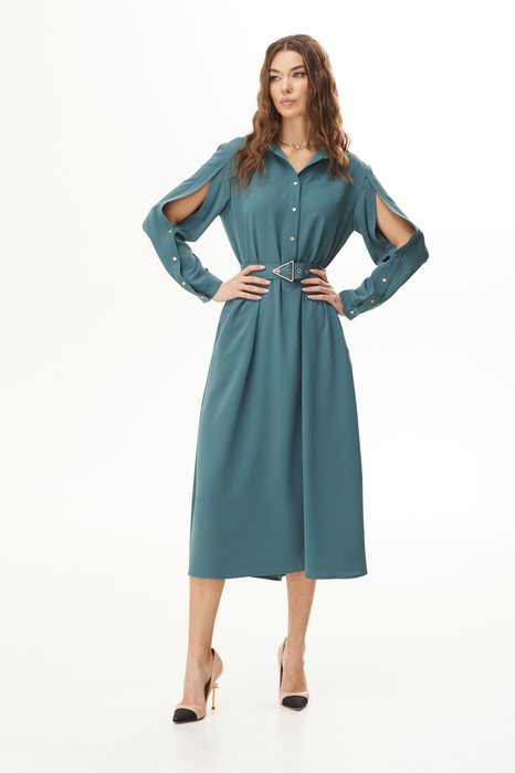 Платье свободной формы из струящейся ткани. Длина миди. Воротник рубашечный. Застежка по переду на кнопки. Длина застежки до талии. По спинке кокетка. В боковых швах карманы. Рукава длинные с манжетой по низу. По передней части рукав с застежкой на кнопки. В комплекте съемный ремень с пряжкой.