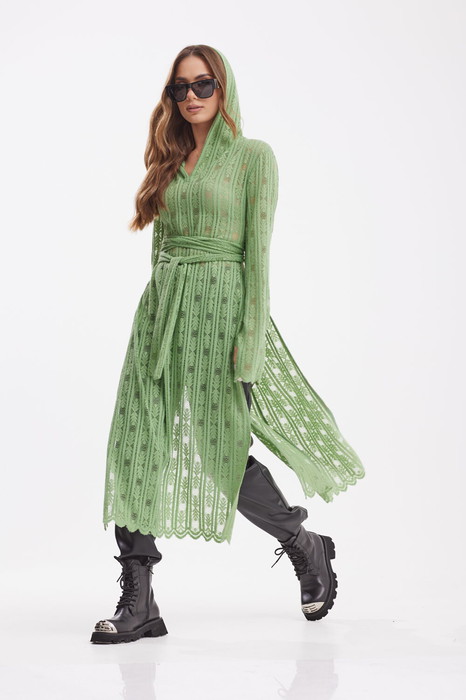 Платье-туника из ажурного трикотажного полотна с капюшоном. Длина миди. Вырез горловины V-образной формы. Рукав узкий, длинный. По низу рукава отверстие для большого пальца. В боковых швах высокие разрезы от талии. Талия фиксируется длинными завязывающимися поясками. Длина 119 см. Длина рукава 67 см.