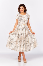 Платье женское выполнено из джинсовой ткани, покроя спущенное плечо. По спинке кокетка и средний шов. Горловина оформлена стояче-отложным воротником. В верхней части переда расположена центально-бортовая застежка-планка на петли-пуговицы. В области талии расположен пояс завязывающийся на металлические полукольца. Нижняя часть платья оформлена планками, застегивающимися на петли-пуговицы.