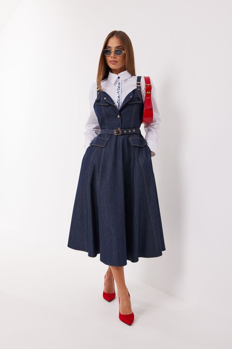 Платье с отрезной линией по талии из джинсовой ткани. Длина миди. Платье на регулируемых бретелях. Застёжка по переду на кнопки и по боку на потайную молнию. По переду клапаны на полочке и на юбке. По талии платье фиксируется съёмным регулируемым поясом на пряжке.