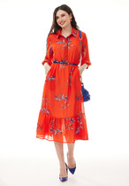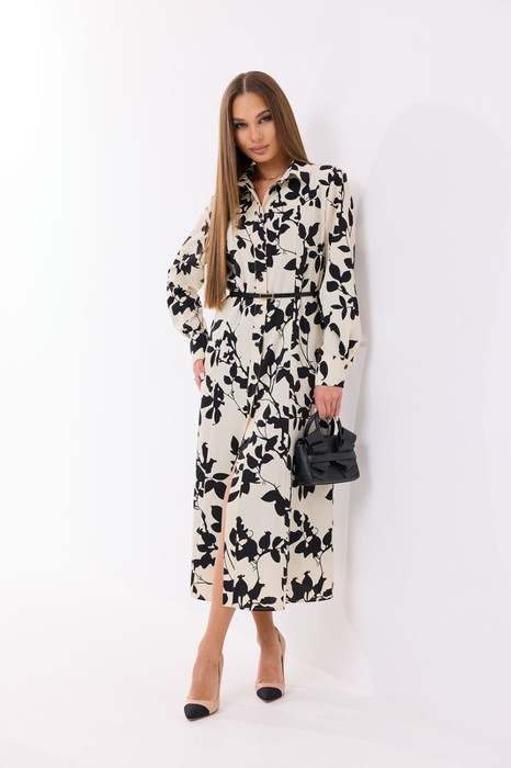 Платье полуприлегающего силуэта с вертикальными рельефами. Длина миди. Кокетка спереди и по спинке. Застёжка спереди на петли и пуговицы. Воротник рубашечный. Рукав прямой, понизу широкая манжета (8 см). Манжета с застёжкой на петли и пуговицы. В боковых швах карманы. Платье на подкладке. В комплекте съёмный ремень.