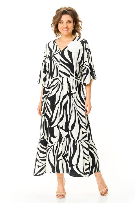 Платье женское А-образного силуэта со спущенной линией плеча. По окату рукава обработана сборка.Горловина V-образной формы. В среднем шве спинки застежка на тесьму-молнию. Перед и спинка выполнена последовательными оборками создающими легкое расклешение низу. В боковых швах обработаны карманы. В комплект входит съемная брошь в виде цветка.