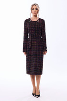 Платье женское полуприлегающего силуэта, заужено к низу. Рукав цельнокроеный типа "летучая мышь" длиной 3/4. Низ рукава обработан притачной манжетой с застежкой на петлю-пуговицу. Горловина обработана блузочным воротником на отрезной стойке. Спинка со средним швом и вытачками. Средний шов спинки с застежкой на тесьму-молнию и шлицей. Перед, до линии талии, с однобортной застежкой на петли-пуговицы. Имеется отделочный навесной пояс контрастного цвета. Для поддержания пояса на линии талии обработаны шлёвки. По переду обработаны карманы с отрезным бочком.