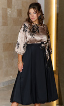 Невероятно красивое и элегантное платье отвечает всем требованиям вечернего наряда!  Сочетание тканей разных фактур и дизайнов в одной модели  - тренд сезона.  Для лифа с мягкими присборенными рукавами мы выбрали пластичный атлас, а формоустойчивую тафту - для создания модной юбки «баллон». Сдержанный блеск атласа с деликатным принтом подчеркивает  глубину тона черной тафты. Платье отрезное по талии, с круглой горловиной. Рукав длиной 7/8 со спущенной проймой и сборкой по низу на резинку. Длинная юбка «баллон» собирается по талии на эластичную ленту в отрезном поясе. По поясу платье декорировано бантом  в виде съемной броши.  Длина платья от высшей точки плечевого шва до низа – 129 см (р.48-52)- 130 см (р.54-58). Длина рукава – 31 см.