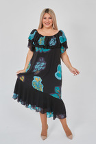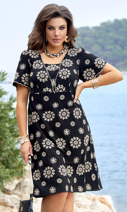 Летнее стильное женское платье с коротким рукавом - идеальное дополнение к гардеробу модницы. Это женственное платье с очаровательным вышитым дизайном идеально подходит для вечерних прогулок, отдыха, а также для работы в офисе.  Сочетание чёрного цвета с бежевым дизайном придаёт платью своеобразную яркость. Платье без подкладки, длина плюс-минус середина колена (в зависимости от роста), расширяется к низу. По переду платья подрез под грудью и талиевые вытачки, горловина с V-образным вырезом, красиво выложенными фестонами, и треугольной вставкой. Рукав в платье короткий с фестонами по низу. Спинка в платье без особенностей. Низ в платье ровный. Длина платья от высшей точки плечевого шва до низа 103 см (р.50-54), 106 см (р.56-60).  Длина рукава 24 см.