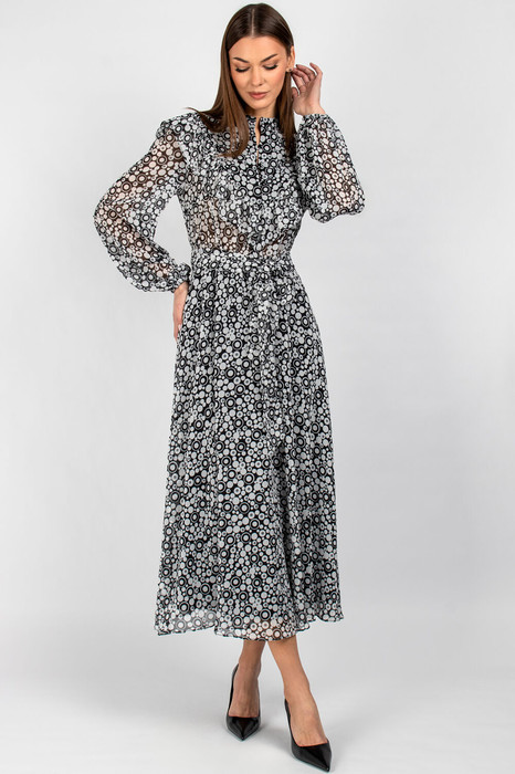 Втачные одношовные рукава с изящной сборкой у оката и эластичными манжетами идеально сидят по фигуре, не стесняя движений. Воротник-стойка придаёт платью строгий, но женственный вид, а завязывающийся пояс позволяет регулировать объём талии, создавая желаемые пропорции.