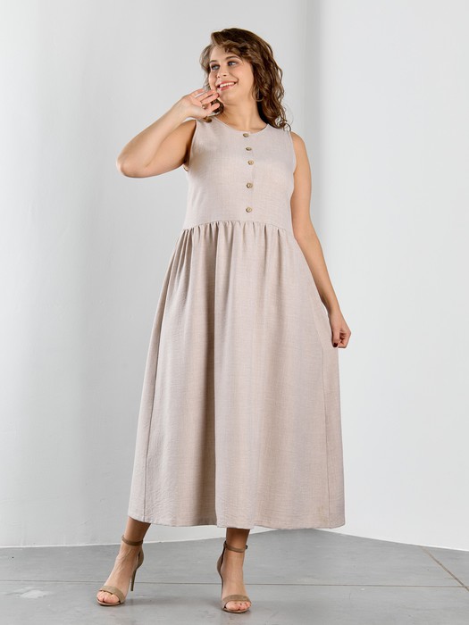 Платье женское из гладкокрашеного тканого полотна, отрезное по линии талии, длинное, без рукавов, с горловиной овальной формы и центральной бортовой застежкой по лифу на петли и пуговицы. Юбка присборена по шву стачивания с лифом, горловина и проймы окантованы основным материалом.