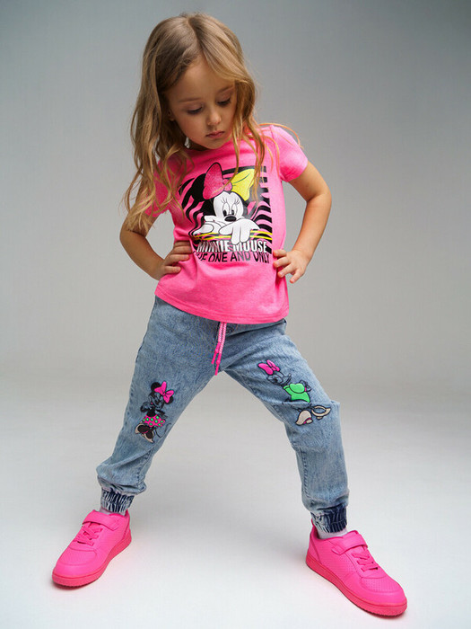 Джинсы из эластичного денима с принтом Disney. Jogger fit – джинсы спортивного силуэта, свободные в области паха со слегка заниженной линией шага, манжетами на щиколотках и средней посадкой на бедрах. Застежка на кнопки. Эластичный пояс со шнурком. Функциональные карманы.