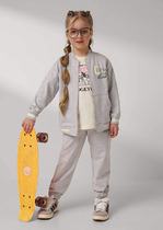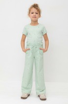 Детские джинсы для девочки. Пояс на резинке дополнен цветным шнурком, который позволяет регулировать посадку. Модель выполнена с ярким принтом в виде маленьких вишен. Джинсы имеют прямой крой и длину до щиколотки. Спереди — два кармана, сзади — два накладных кармана. Низ брюк аккуратно подшит.