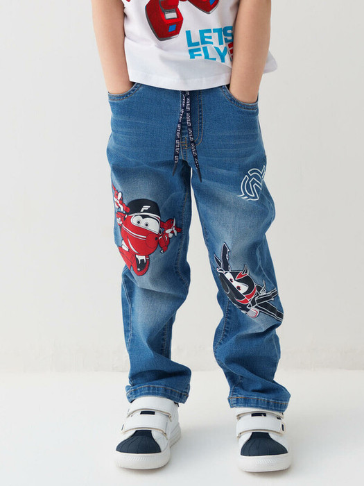 Детские джинсы свободного кроя для мальчика. Пояс на резинке с удобным шнурком для регулировки. На передней части брюк расположены яркие принты с героями из серии Super Wings, а также декоративный логотип. Сзади – два кармана, один из которых украшен красной нашивкой. Штанины завершаются аккуратными подворотами.