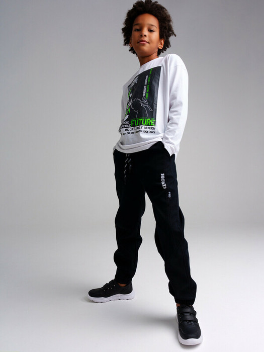 Джинсы, утепленные флисом. Посадка jogger fit – спортивный силуэт, свободные в области паха со слегка заниженной линией шага. Эластичный пояс со шнурком.  Манжеты на резинке.