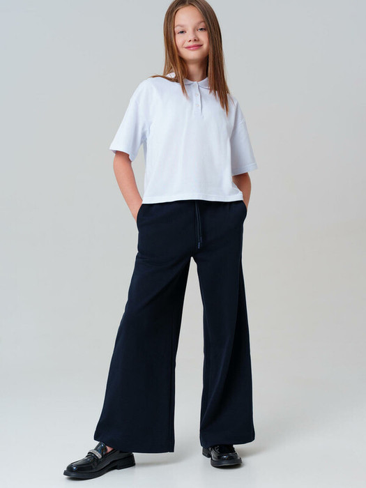 Классические тёмно-синие трикотажные брюки палаццо для девочки подростка от PlayToday — модная школьная классика в современном исполнении. Лёгкие, свободные и удобные, эти классические подростковые штаны подойдут как для занятий, так и для повседневных прогулок и активных перемен.