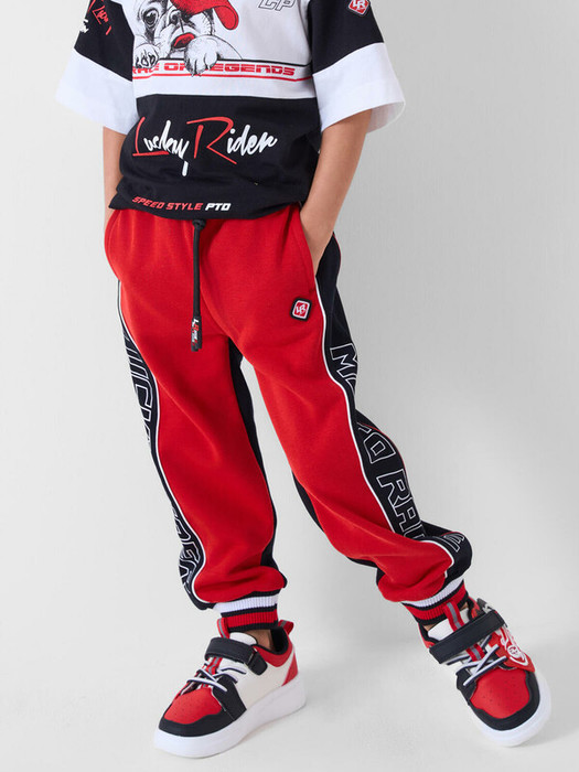 Брюки-джоггеры детские для мальчика. Выполнены из хлопкового трикотажа футер без начеса. Модель прямого кроя со средней посадкой на талии. Пояс выполнен на резинке, дополнительно регулируется шнурком. По бокам — удобные карманы. В нижней части брючин предусмотрены эластичные трикотажные манжеты для лучшей фиксации. Брюки украшены лампасами, принтами и нашивкой в гоночной тематике.