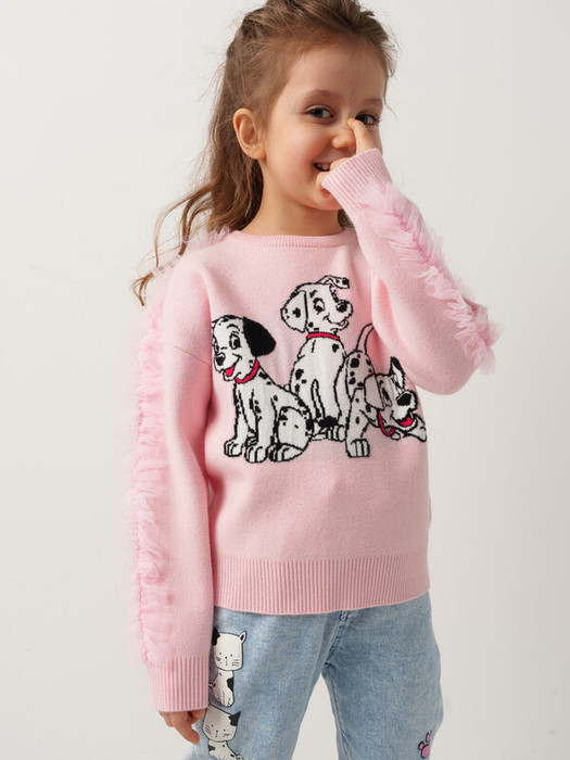 Детский джемпер для девочки. Модель из мягкого, вязаного трикотажа, прямого кроя с длинными рукавами. Украшена очаровательными оборками. Спереди размещён яркий принт с изображением трёх щенков-далматинцев, что придаёт изделию игривый и привлекательный вид. Горловина, манжеты и низ изделия обработаны мягкой эластичной резинкой в рубчик, обеспечивающей комфорт при носке.