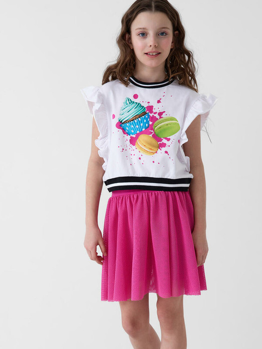 Футболка для девочки подростка. Модель укороченная, выполнена из эластичного хлопкового трикотажа джерси. На груди расположен красочный принт с изображением капкейков и макарунов. Горловина и низ изделия, обработаны эластичным рибом. Рукава - крылышки.