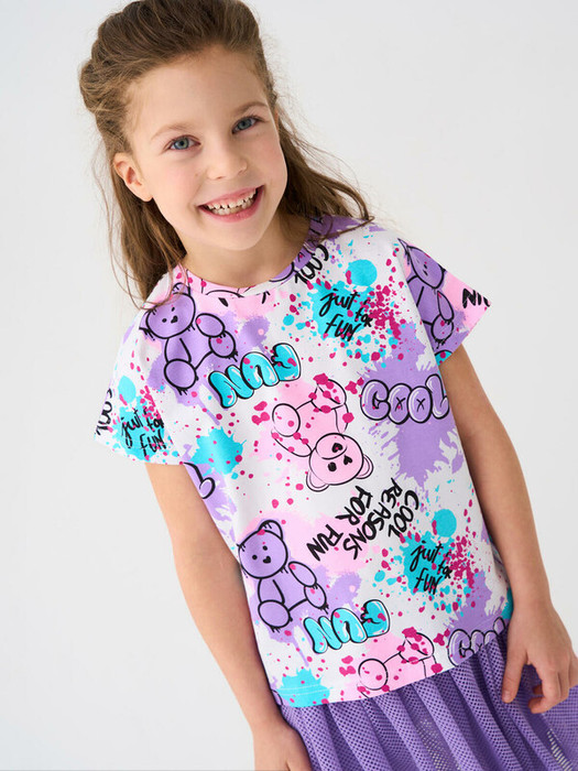 Детская футболка для девочки. Модель прямого кроя, выполнена из эластичного хлопкового трикотажа джерси. Красочный принт с милыми мишками. Горловина круглая.
