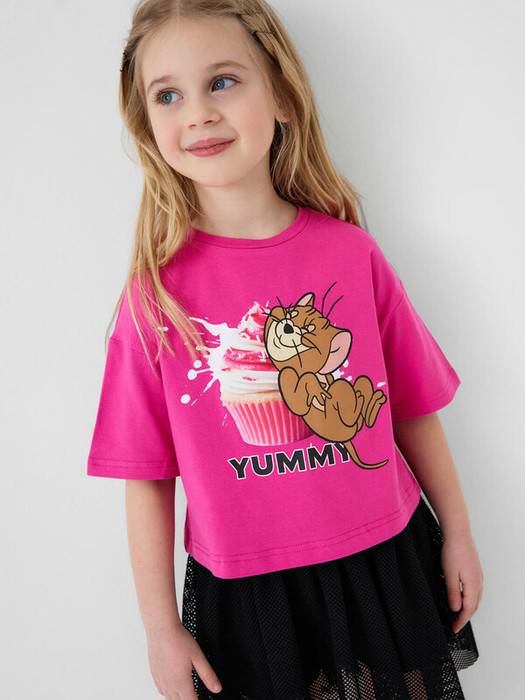 Детская футболка оверсайз для девочки. Модель выполнена из эластичного хлопкового трикотажа джерси. Спереди расположен крупный принт с любимым персонажем "Том и Джерри".