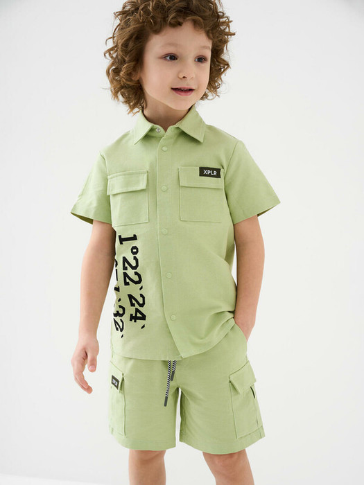 Легкий детский хлопковый костюм для мальчика. Рубашка прямого кроя с коротким рукавом и застежкой на кнопки. Классический воротник, накладные карманы. Свободные шорты на резинке со шнурком для регулировки. Удобные боковые карманы и карманы-карго.