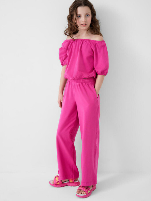 Детский легкий комплект для девочки. Состоит из футболки и прямых брюк на резинке. Выполнен из хлопкового трикотажа. Футболка свободная, с округлым вырезом и мягкой сборкой по горловине и низу, за счёт чего выглядит воздушной и комфортной. Брюки — прямые, со средней посадкой на резинке.
