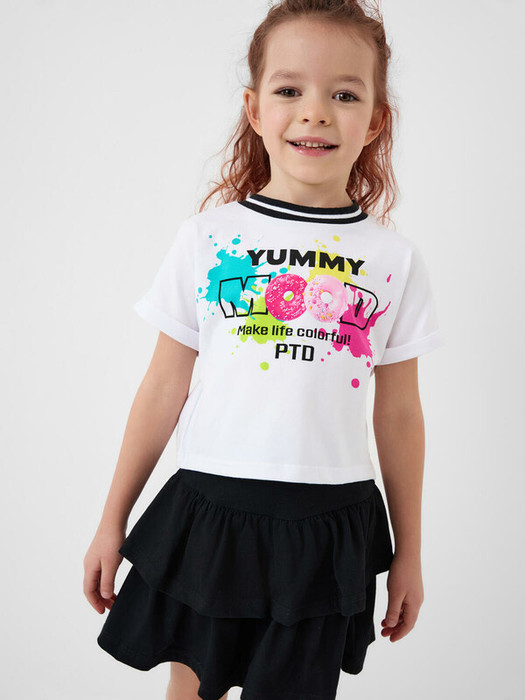 Легкий детский комплект для девочки. Выполнен из мягкого хлопкового трикотажа джерси, состоящий из укороченной футболки и юбки-шорт. Футболка свободного кроя с ярким принтом. Пышная юбка на резинке с воланами, внутри имеет удобные шорты, что делает модель практичной для активного отдыха.