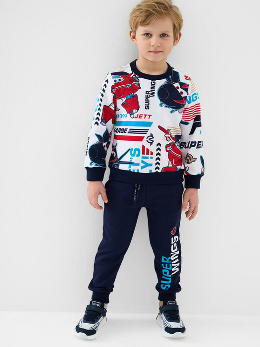 Детский спортивный костюм для мальчика. Комплект выполнен из хлопкового футера и состоит из свитшота и джогеров на резинке. Толстовка прямого кроя с красочным принтом "Super Wings". Манжеты и пояс выполнены из эластичного риба, благодаря чему изделие хорошо держит форму. Брюки джоггеры — комфортные, с эластичным поясом и шнуром для регулировки посадки. Удобные боковые карманы. Низ штанин собран на резинку.