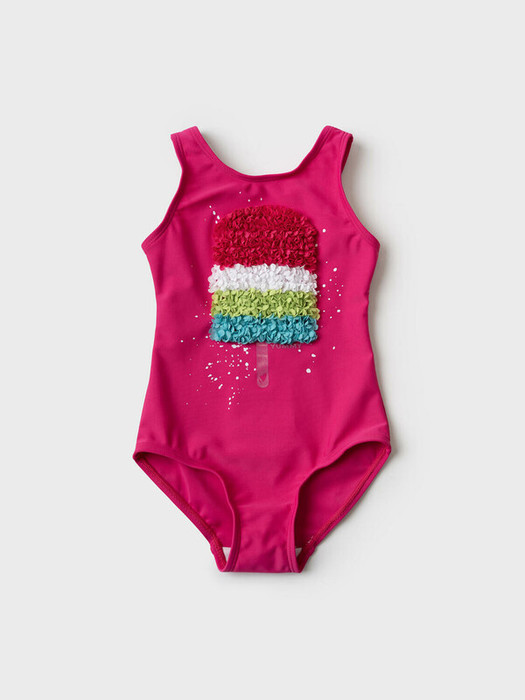 Слитный детский купальник для девочки, выполнен в насыщенном розовом цвете. Модель с широкой проймой и закрытой спинкой, на которой есть поперечная резинка для удобной посадки. Главный акцент – цветное мороженое из оборок на груди, выполненное в технике аппликации и печати. Купальник имеет подкладку. Все края обработаны эластичной тесьмой, чтобы изделие хорошо сидело на теле и не натирало. Благодаря UF-защите, ткань сохраняет первоначальный вид даже при длительном пребывании на солнце. Подходит для пляжа и бассейна.