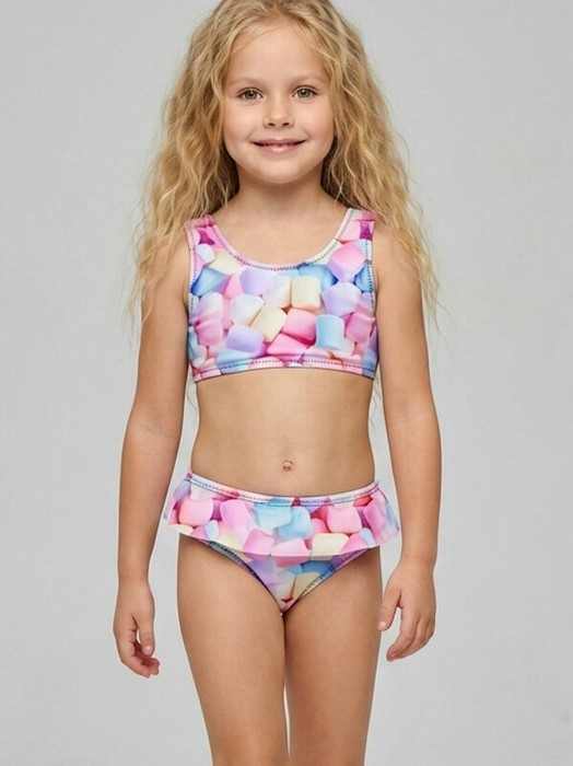 Купальник детский раздельный для девочки. Верх имеет круглый вырез и плотно прилегает к телу, а плавки средней посадки украшены оборкой по поясу. Яркий фотопринт с изображением разноцветного маршмеллоу делает изделие особенно привлекательным и веселым. Внутри предусмотрена подкладка. Все края обработаны эластичной тесьмой, чтобы изделие хорошо сидело на теле и не натирало. Благодаря UF-защите, ткань сохраняет первоначальный вид даже при длительном пребывании на солнце. Подходит для плавания и активного отдыха.