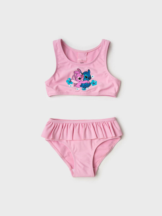 Купальник детский раздельный для девочки. Верхняя часть — топ с круглым вырезом. На груди — яркий и милый принт с героями мультфильма Лило и Стич и цветами. Плавки украшены оборкой по талии, что придаёт образу нежность. Внутри — подкладка. Все края обработаны эластичной тесьмой, чтобы изделие хорошо сидело на теле и не натирало. Благодаря UF-защите, ткань сохраняет первоначальный вид даже при длительном пребывании на солнце. Подходит для плавания и активного отдыха.